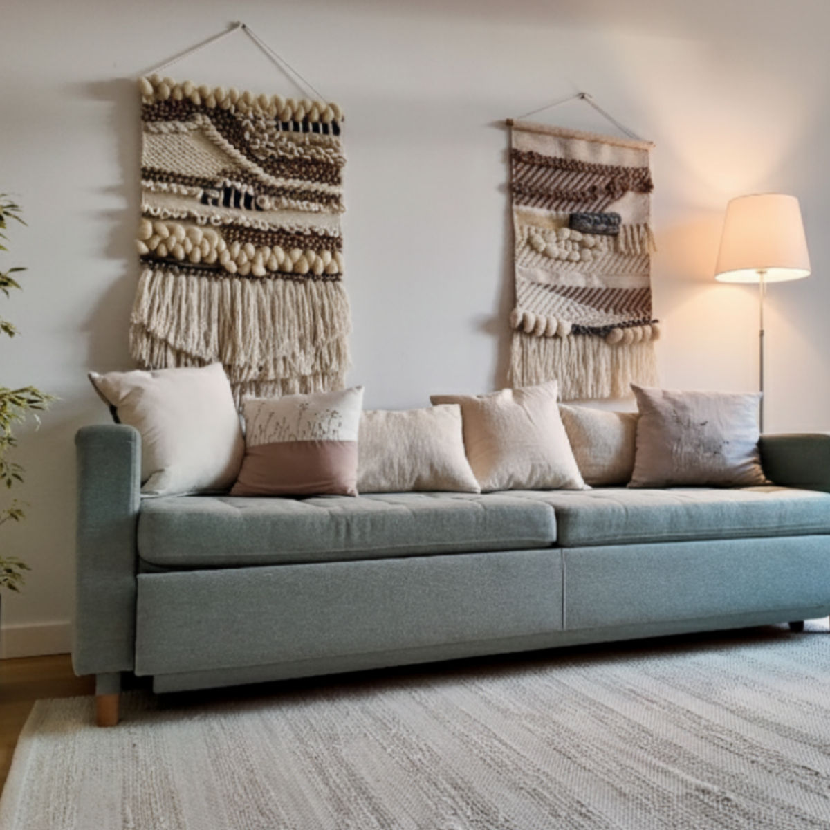 Add warmth and texture to your walls with this handmade wall hanging — a beautifully hand-woven wall decor piece (håndvævet vægdekoration) crafted from soft New Zealand wool in calming, natural tones.