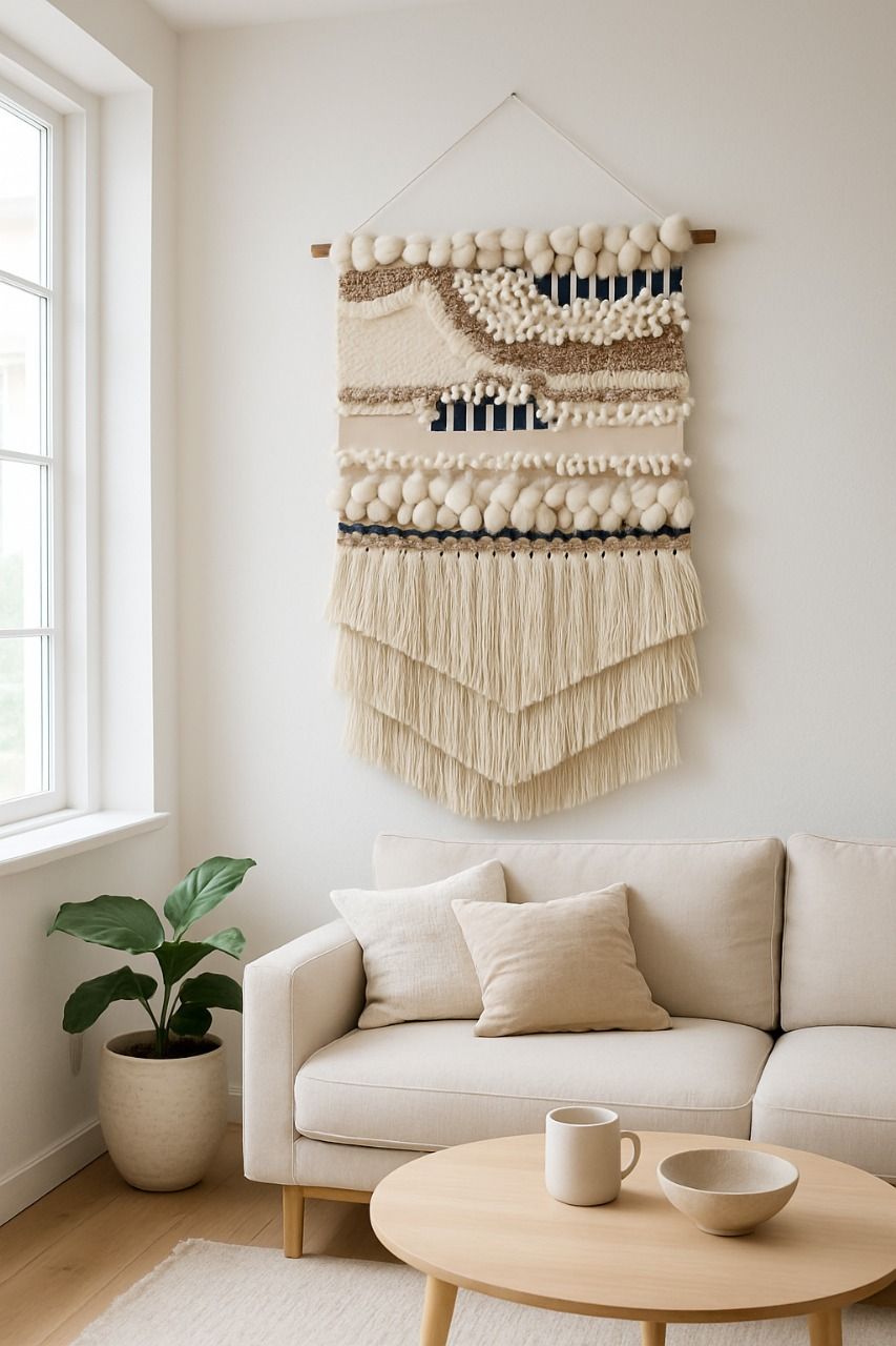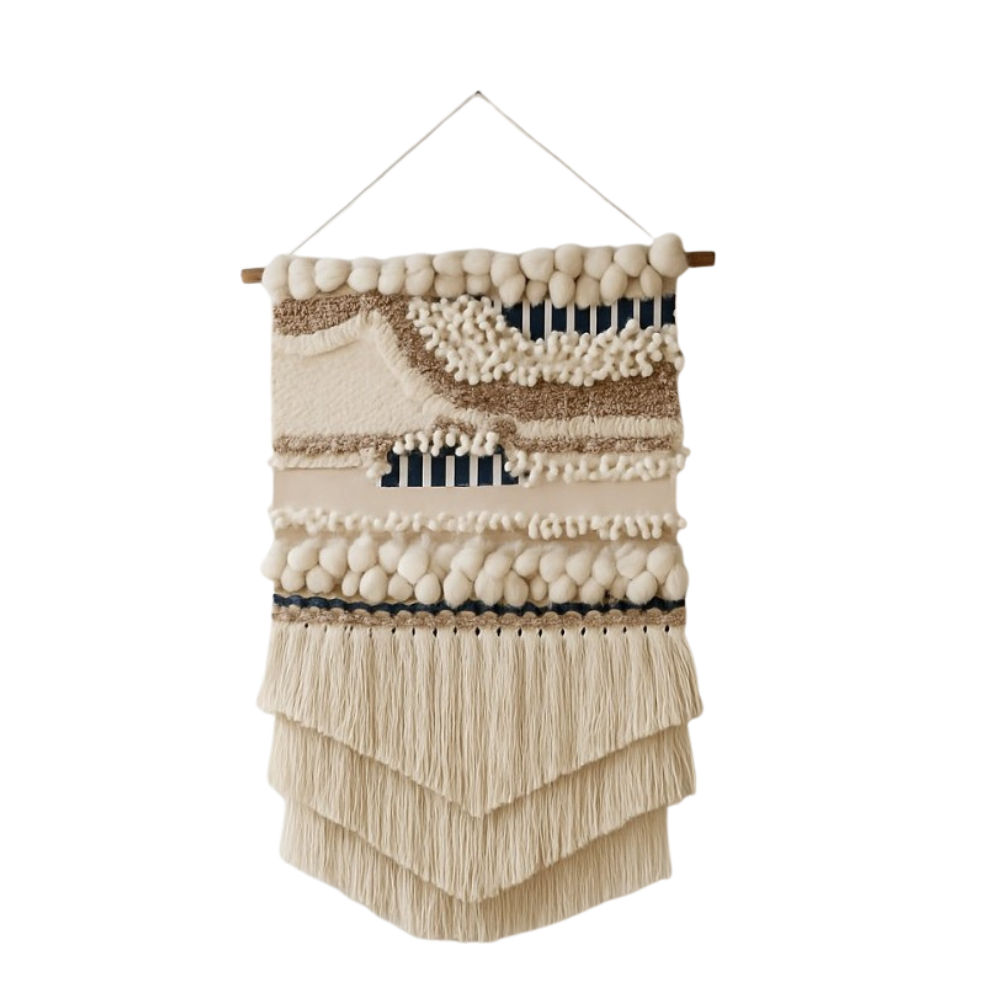 Add warmth and texture to your walls with this handmade wall hanging — a beautifully hand-woven wall decor piece (håndvævet vægdekoration) crafted from soft New Zealand wool in calming, natural tones.