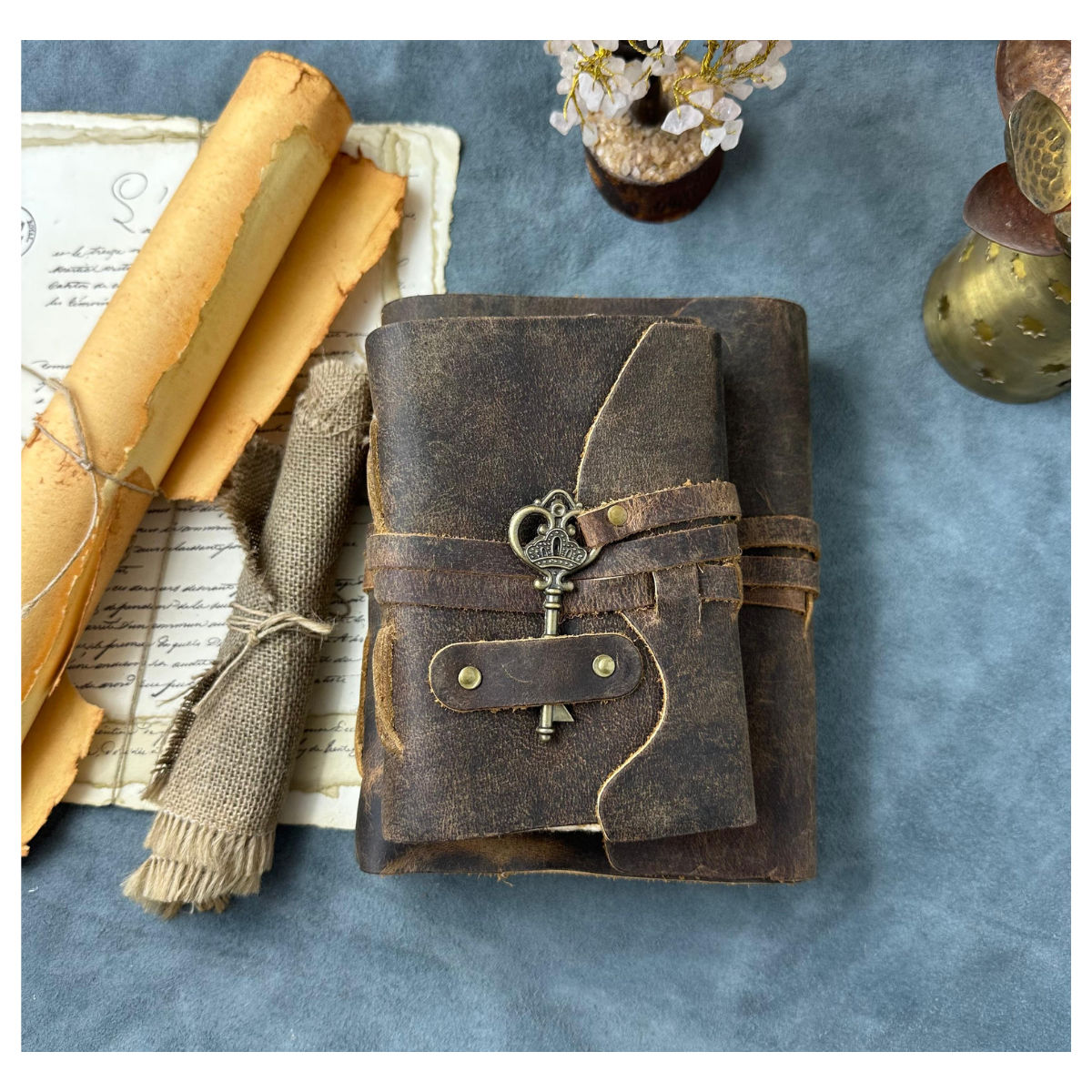 Capture your thoughts, dreams, and journeys in Veda, a handcrafted leather journal designed for modern storytellers. Bound in genuine rustic leather and finished with a vintage key closure, this journal is perfect for writing, sketching, or gifting. The recycled cotton paper adds an artisanal touch, making each page unique and eco-friendly. Ideal as a travel diary, gratitude journal, or creative notebook – Veda keeps your memories safe for years to come.